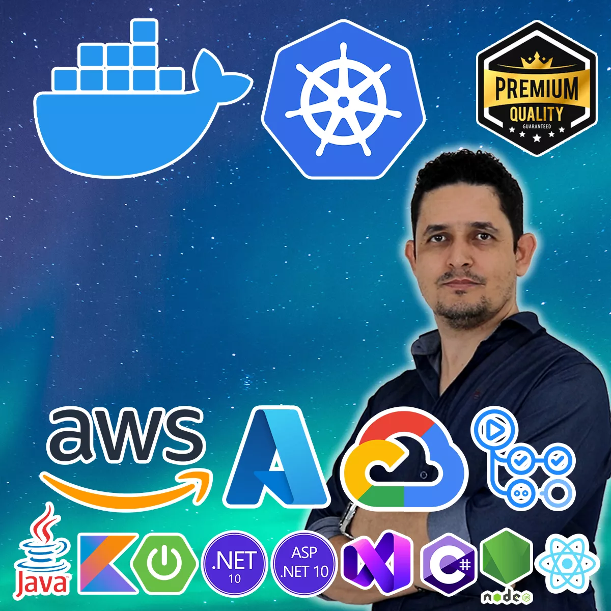 Neste treinamento com mais de 18 horas de conteúdo prático, você aprenderá a dockerizar e orquestrar aplicações completas em Java, Kotlin, ASP.NET 10 e Node JS com React, e a implantá-las nas três principais plataformas de nuvem — Amazon AWS, Microsoft Azure e Google Cloud Platform — com pipelines automatizados de CI/CD usando GitHub Actions.