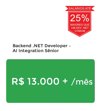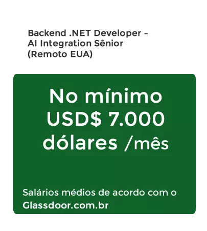 Domine Inteligência Artificial com .NET AI, as mesmas tecnologias utilizadas por empresas como Meta, Amazon, Apple, Netflix, Nvidia e Google — e cada vez mais por empresas no Brasil e no mundo todo. Profissionais qualificados ganham entre R$ 6 e R$ 30 mil reais no Brasil. Trabalhando remoto para o exterior, você pode ganhar 50% a 80% do salário americano (mínimo US$ 5 mil dólares), muito acima do mercado local.